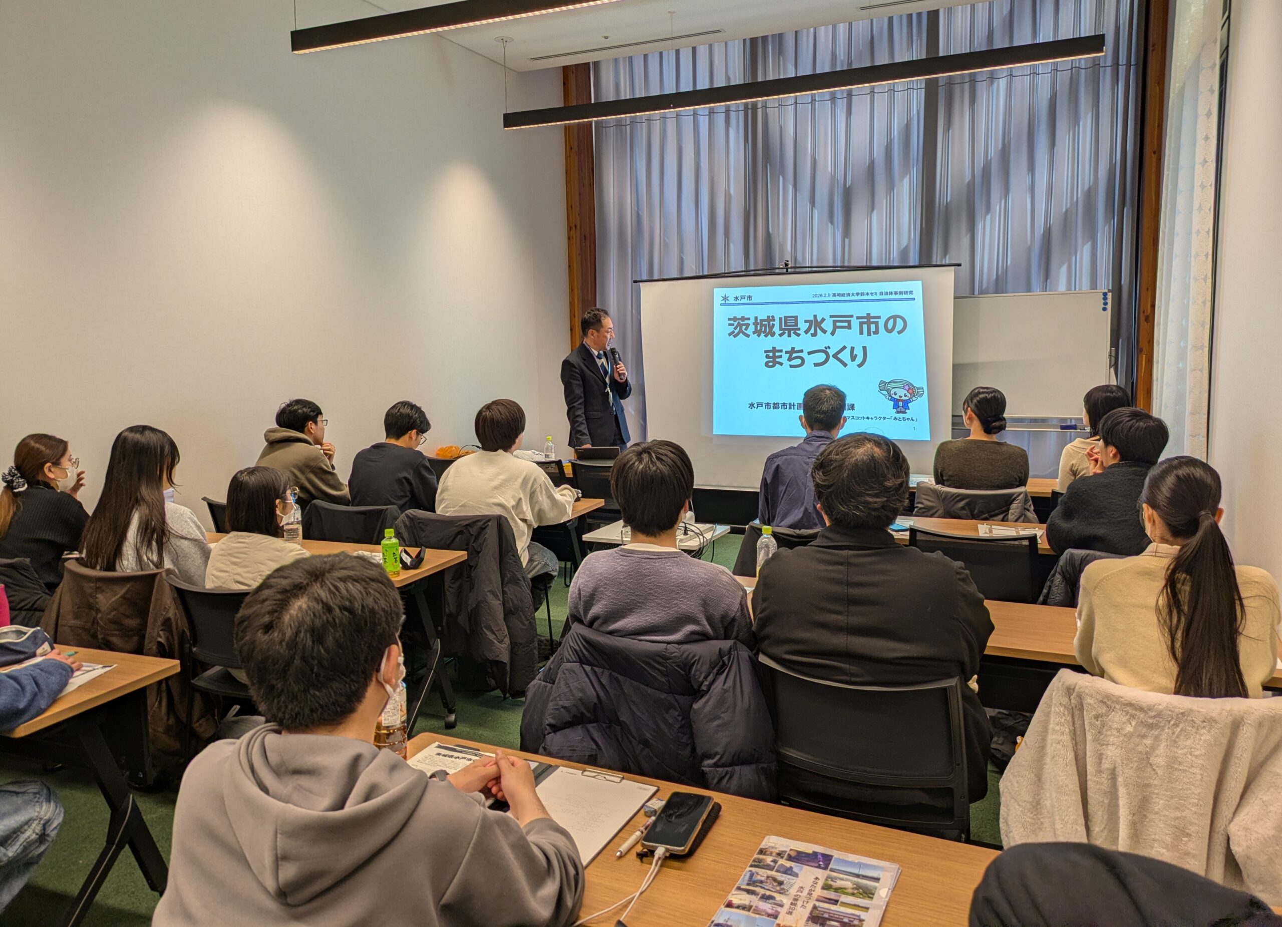 ・市民会館の会議室で須藤氏から水戸市のまちづくりについて講義をいただき、その歴史、現状などを勉強しました。